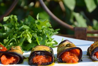 Sur chaque tranche d'aubergine, disposer 1 cuillère à soupe de concassée de tomates rouler pour former des cannelloni.
