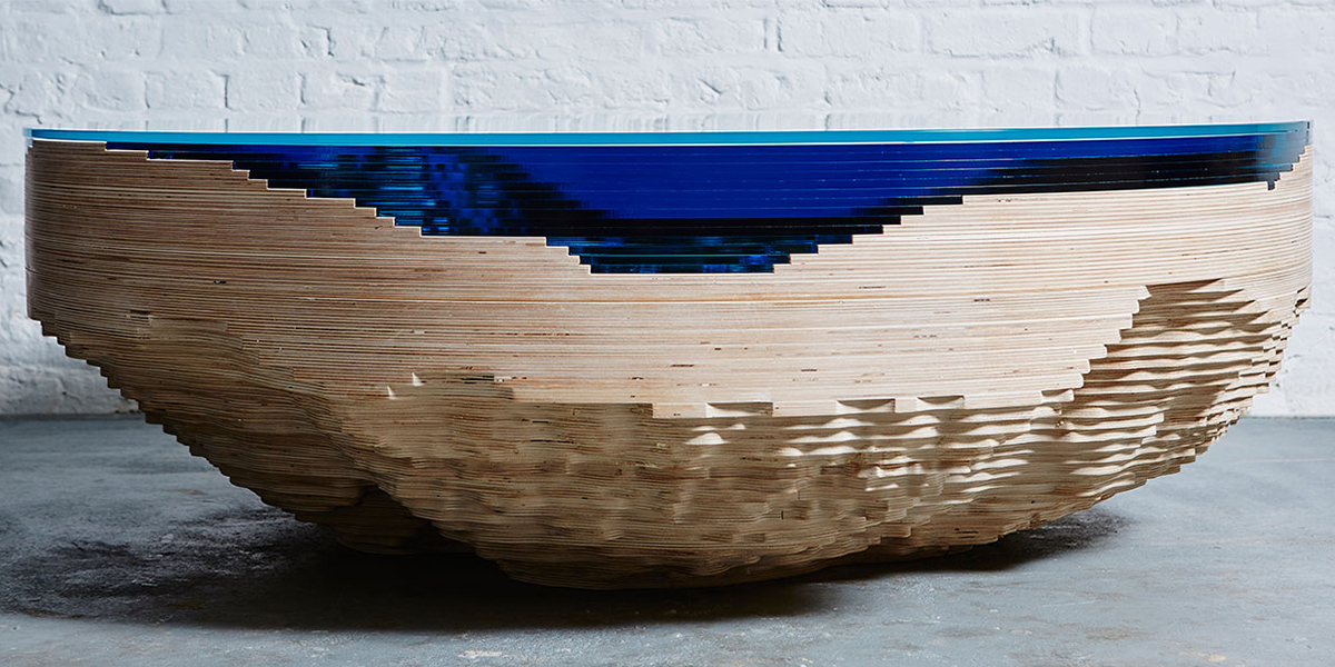 Dans le studio londonien, l’équipe de conception produit a passé un an à développer la table basse en expérimentant le verre sculpté, le Plexiglas et le bois, disposés de façon à représenter une carte géologique 3D. L’équipe a réussi à re-créer une image de l’abîme qui avait au préalable capté Duffy imagination.