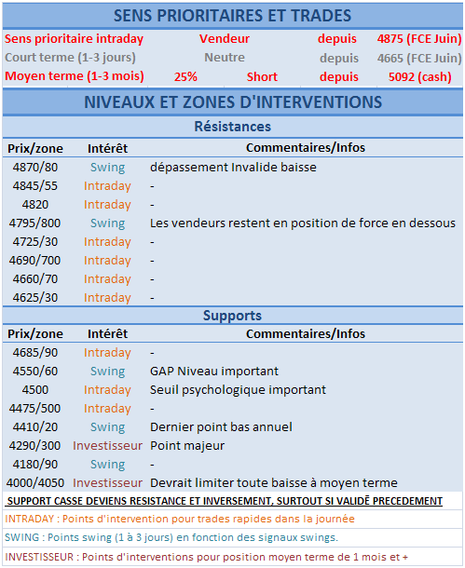 Nous sommes dans un marché baissier avec un Cac faible comparé aux autres indices. A court terme aucun signal ne se dessine, prévoir le prochain mouvement relève donc du pile ou face. Nous sommes actuellement dans un range entre 4635 (38% de retracement de dernière vague de baisse) et la zone support des 4590. En théorie, une cassure des 4585/90 devrait renvoyer très vite sur le gap à 4550/40. Si des signaux sont présents sur ces niveaux, nous n'hésiterions pas à prendre position à l'achat pour jouer un swing important.