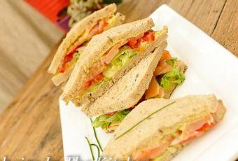 - Sur une tranche, déposez de la salade, des lanières de concombre, 4 demi tomates, 1 radis tranché, le saumon fumé et fermez avec une seconde tranche de pain de mie préalablement tartinée de mélange fromage blanc/moutarde