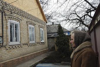 [Archive CICR] – mars 2016 – Région de Donetsk, Marinka. Svetlana, en face de sa maison reconstruite par le CICR.