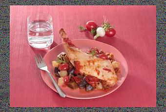 – La cuisse de lapin, oignons grelots caramélisés, poêlée d’aubergines