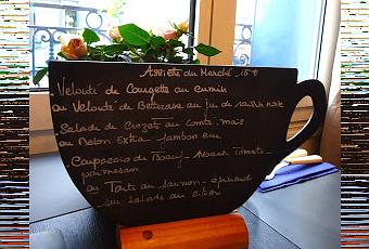 Le menu du midi est inscrit sur l'ardoise. Il change tous les jours selon les produits du marché. Le samedi de mon passage nous avions le choix entre- un velouté de courgettes au cumin,- ou un velouté de betteraves au jus de raisin noir