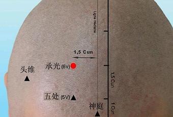 Sur la tête, à 1,5 Cun en arrière du point 5V (Wu Chu), à 1,5 Cun latéralement de la ligne médiane, et à 2,5 Cun au-dessus de la ligne antérieure des cheveux.
