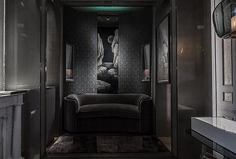 La pièce doit se découvrir par de multiples sens, plongée dans une semi obscurité, le sol, sur lequel le visiteur est invité à se déchausser, est en peau d’agneau rappelant l’arrière des vieilles Bentley, « dans la continuité de la garçonnière où l’on arrive à la verticale et où l’on veut finir à l’horizontale sur une peau de bête douce et agréable ».