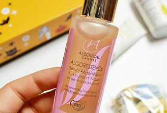 ALGOVITAL – algoressence est un sérum régénérant aux huiles d’argan et de rosier muscat dont 100% des ingrédients sont d’origine naturelle et 67% sont bio. Ce sérum est également composé d’extraits marins de lavande de mer, d’extraits d’algue alaria esculenta et d’huile de sésame. Un sérum qui laisse la peau rebondi au réveil, effet que j’ai pu observer car je possède déjà ce sérum depuis quelques temps et je l’aime beaucoup. J’avoue ne pas l’utiliser tous les jours mais quand ma peau est terne, je l’applique le soir mélange à ma crème hydratante et le matin tout va mieux ! Et comme on en met assez peu à chaque fois, le flacon dure très longtemps ! 30ml
