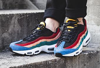 La Air Max 95 est avec la Air Max 1 une des valeurs sûre de la marque américaine qui nous les proposent en dizaine de nouveaux coloris chaque saison n’en déplaisent aux amoureux de ces modèles iconiques. La Air Max 95 est cependant cette saison présentée dans une déclinaison plutôt unique qui s’appuie sur sa construction en courbe si particulière pour nous délivrer une empeigne multicolore au touché texturé. Ce motif multicolore s’associe ainsi paradoxalement bien avec le noir d’une partie supérieure de la paire qui dispose également d’une touche de jaune sur sa languette.