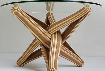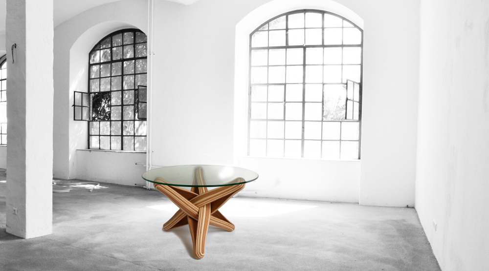 « J’ai pensé à une forme avec des pieds entrelacés sur laquelle je construirais la base de ma table. Je cherchais un chemin pour contourner l’obligation d’avoir ces pieds qui se rejoignent au centre de la table ; je voulais plutôt qu’ils se fixent sur les contours extérieurs tout en se rencontrant les uns les autres. Après quelques variations, mon choix s’est porté sur six pieds qui s’enchevêtrent les uns dans les autres ce qui permet la stabilité de la table. »