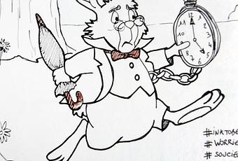 J'ai choisi de rebondir sur une remarque de mon dessin précédent, en choisissant un personnage d'Alice au Pays des Merveilles... le lapin blanc. Il est toujours soucieux, les yeux rivés sur sa montre, car il est en retard.