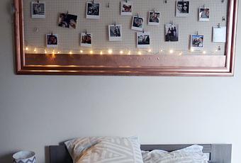 Et voilà le résultat! Pour le personnaliser, j'ai acheté des petites pinces qu'on trouve chez Ikea, parfaites pour accrocher les photos. J'ai également ajouté une petite guirlande lumineuse trouvée chez Forum + qui a l'avantage de fonctionner avec des piles pour éviter d'avoir des cables qui pendent!
