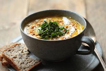Pour servir cette soupe , j'ai ajouté du Dukkah , c'est un mélange d'épices et de noix . J'ai découvert cette préparation chez Ottolenghi et j'ai réalisé mon propre mélange . Il est souvent à base de graines torréfiées de coriandre , cumin et fenouil et ensuite on y ajoute au choix ; des noisettes , du sésame , des graines de tournesol , des noix de cajou ... J'aime en mettre sur mes légumes en fin de cuisson mais aussi sur du poulet ou du mouton ...