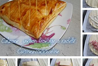 Pour 2 Calzones1 pâte feuilletée de la crème fraîche épaisse2 tranches de jambon4 tranches de fromage à raclette 1 jaune d'oeuf avec un peu de lait pour la dorureRéalisation: