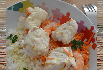 4 personnes : 4 portions de poisson (julienne, lieu..), 8 crevettes roses épluchées, 2 carottes, sel, poivre, 20 cl de crème liquide (15% MG ici), quelques pistils de safran, riz pour accompagner