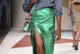 Les accessoires ne sont pas en reste. Les chaussures, qui prennent la forme d’un mocassin à bout carré et le talon des bottes, arborent des patchs en cuir polychrome. Le Lovy Bag, le nouveau sac icône de Trussardi, se pare de pois, logomanies et cuirs miroir et multicolores.