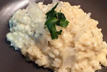 Hier soir chéri s’est lancé dans une improvisation de risotto aux truffes et Manchego pour utiliser les brisures de truffes que nous avions ramenées de France il y a quelques temps et pour sortir un peu des sentiers battus en utilisant du Manchego, un fromage espagnol, à la place du parmesan, ingrédient incontournable en principe du risotto.