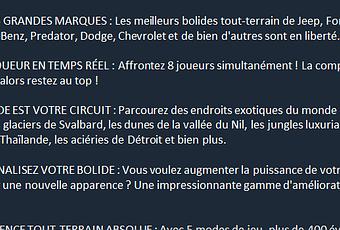 35 monstres mécaniques n’attendent que vous pour libérer la bête qui sommeille. Des monster truck en passant par des buggy, pick-up, ce sont 7 véhicules tout-terrain, de marques connues telles que Ford, Jeep, Mercedes-Benz et autres, sont disponibles dès maintenant pour vous, utilisateurs d’appareils mobiles, pro iOS avec iPhone,iPad, iPod Touch ou pour vous autres, adeptes des Windows Phone ou Android.