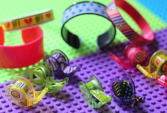 Le kit comprend des bracelets en plastique de différentes largeurs, plusieurs rouleaux de masking tape à motifs et des strass. Il est très simple de personnaliser ses bracelets. Hélia a réussi du haut de ses 3 ans, même si le scotch n’est pas parfaitement collé, mais c’est aussi ce qui crée du charme