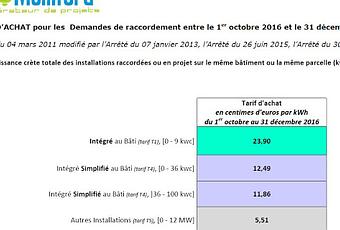 Les tarifs d'achat pour la période du 1er octobre 2016 au 31 décembre 2016 ont été déterminés par la CRE et devront être validés par arrêté ministériel.