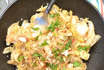 Les noisettes apportent quant à elle du croquant au plat (des cacahuètes feraient aussi très bien l'affaire). On obtient ainsi un plat sain et léger ou un accompagnement à servir, par exemple, avec des nems aux légumes ou tout autre mets qui vous fera plaisir (pas forcément asiatique, d'ailleurs !).