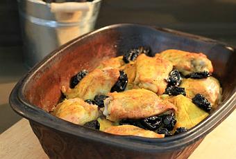 8 morceaux de poulet 1 oignon 25 pruneaux 500gr de fruit à pain 3 gousses d'ail gingembre frais râpé 1 c. à c. de ras el hanout 1 c. à c. de cumin 1 c. à c. bombée de curcuma huile d'olive sel et poivre du moulinzeste de citron