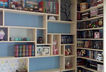 -Il y a quelque temps, je vous parlais de notre projet de décoration de notre espace commun/pièce à vivre/salon, initié par l'étagère Ours de chez Little nice things (L'objet de la semaine #13).-Cette bibliothèque sur mesure est un projet qui a duré plus d'un mois (plans, montage, commande du bois, montage sur le mur et choix du papier peint) et qui nous a occupé durant toutes nos vacances de Toussaint !-Parce que dans une maison de hobbit, chaque coin d'espace doit servir de rangement et que le choix d'un meuble sur mesure s'imposait.-Parce que cette bibliothèque contient tout ce qu'on aime : côté geek, coin jeux, livres pour enfants, blu-ray, bonbons, kawaï, Harry Potter, déco vintage/pop/nordique... -Parce que j'ai pu ranger tout notre bazar et que chacun a son coin correspondant à nos activités respectives (jeux de société/ videos, Harry Potter, coloriages, jeux d'éveil pour notre fils de 2 ans, rayon spécial Disney et dessin animés). Il y a encore des rayons vides ;-) et ça c'était inespéré! -Parce qu'on en a bavé pour la faire et la monter et que même si c'est pas parfait, pour nous elle l'est! On l'adore parce qu'on l'a conçu selon nos goûts et nos envies!