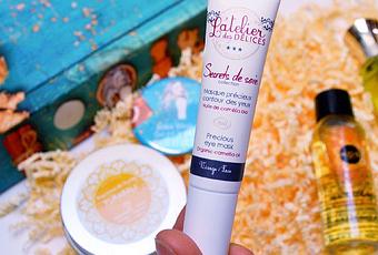 - L’ATELIER DES DELICES – masque précieux contour des yeux. Ce soin est composé d’huile de camélia qui protège et assouplit; d’huile de sésame qui régénère le tissu cutané, d’huile d’abricot qui préserve le captal jeunesse et de beurre de karité qui hydrate et nourrit le contour de l’oeil. 15ml