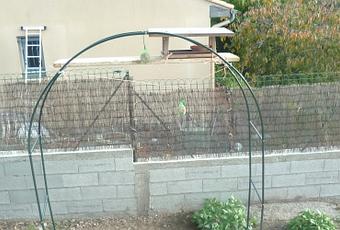 J'ai acheté une arche à rosiers, non pas pour y faire grimper un rosier, mais pour pouvoir nourrir les oiseaux sans que les chats ne viennent les déranger. Fixée sur le bord de la terrasse, les pieds bien enfoncés dans la terre en bas, elle attire déjà quelques oiseaux de passage dans le quartier.