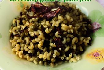 300 gr de coquillettes - 1 c.à.s d'huile d'olive - 200 gr de petits pois - 200 gr de champignons de votre choix - 1 oignon - 2 gousses d'ail - sel & poivre.