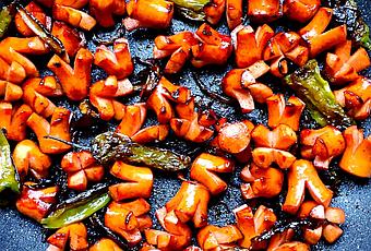 2 – Dans une poêle, faire revenir les oignons d’abord pendant 5 minutes à feu fort afin de bien les faire suer. Ajouter ensuite les piments en remuant un peu. Il faut que les oignons soit bien colorés et deviennent très marrons.