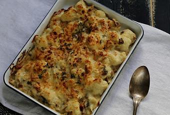1 gros choux fleur 40 gr de beurre salé 1 gousse d'ail 3 échalotes 500 ml de lait muscade 80 gr de parmesan râpé 1 cuil à soupe d'huile d'olive 150 gr de champignons émincés 4 tranches de jambon cru 6 branches de thym 60 ml de vin blanc le jus '1/2 citronDécoupez la moitié du choux fleur en petits morceaux , et faites le blanchir 1 minute dans l'eau bouillante salée . Égouttez. Coupez le reste du choux fleur en petits morceaux puis hachez le finement au mixeur . Faites fondre le beurre dans une sauteuse , ajoutez la gousse d'ail et 2/3 des échalotes émincées , cuisez à feu moyen pendant 3/4 minutes sans cesser de remuer . Ajoutez le choux fleur mixé , le lait et un peu de muscade .Cuisez pendant 10 minutes pour que le mélange réduise et que le choux fleur soit tendre . Transvasez dans le bol du blender , ajoutez 40 gr de parmesan , salez légèrement et poivrez et mixez pour obtenir une préparation épaisse et homogène . Préchauffez votre four en position grill . Faites chauffer une cuillère à soupe d'huile d'olive , faites cuire les champignons émincés pendant 3 à 4 minutes à feu vif , ajoutez le jambon coupé en lanières , puis le thym frais et le reste des échalotes , faites revenir pendant 2 minutes puis ajoutez le jus de citron et le vin . Mélangez et faites cuire jusqu'à l'évaporation du liquide de cuisson. Transvasez cette préparation dans un plat allant au four . Répartissez la purée de choux fleur au parmesan , ajoutez 40 gr de parmesan sur la surface et faites griller 5/7 minutes au grill du four . Servez avec une salade .