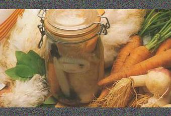 Prenez 2 bocaux neufs d’1 litre. Garnissez-les des morceaux de lapin en les faisant alterner avec les carottes crues et les gousses « en chemise » de la dernière tête d’ail.
