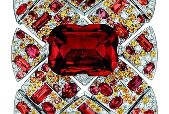 Des carrés de diamants rehaussés de pierres d’exception se juxtaposent dans un jeu de miroirs et évoquent l’esprit de la Couture de CHANEL. Telle une broderie précieuse, cette pièce unique réalisée en en or blanc 18 carats est matelassée de carrés de diamants et parsemée de saphirs oranges. Au centre, un grenat carmin de 52,61 carats se soulève délicatement et dévoile une montre sertie de diamants, en forme de carré galbé.