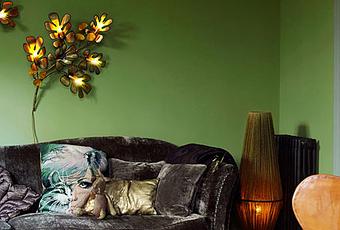 Dans une maison entièrement rénovée à Montmartre, on ose les couleursC'est surprenant mais très réussi, une leçon de style et surtout d'audaceDans la pièce à vivre le choix s'est porté sur le vert absinthe de Emery & Ciequi tranche avec le gris fumé du canapé velours / Un mélange de style, focus sur le coussinchat un brin kitschounet face aux fauteuils Egg de Jacobsen