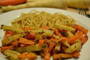 Pour 3/4 personnes : 2 panais, 2 carottes, 2 cs de moutarde à l'ancienne (avec des grains), 1 cc de graines de cumin, 1 cc de coriandre en poudre, 3 cs d'huile d'olive, 2 cs de miel, 1 cc de baies roses + une pincée de poivre, 1 pincée de sel