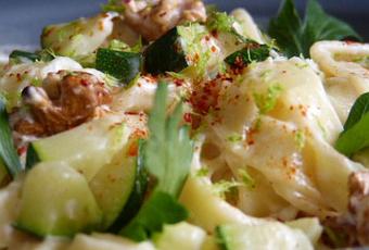 Ajoutez sur les pâtes les courgettes crémées. Ajoutez le zeste du citron vert. Salez, poivrez et saupoudrez le piment d’Espelette.
