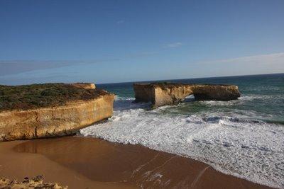 Pour la petite histoire: avant 1990, le petit pont naturel, le "London bridge" (cf. dernière photo) était relié à la rive. On pouvait s'y balader, et passer au dessus de l'océan.Jusqu'en ce jour, le 15 janvier 1990 exactement, où un couple se retrouva coincé sur le rocher, la partie en amont venait de s'écrouler! Des hélicoptères vinrent les tirer de la, donc sain et sauf? Oui, a part que toutes les télés australienne étaient venu pour filmer l'événement, et que le monsieur en question... était accompagner de sa maîtresse! Sa femme fut ravis de découvrir qu'elle était cocue en regardant le 20 heure...