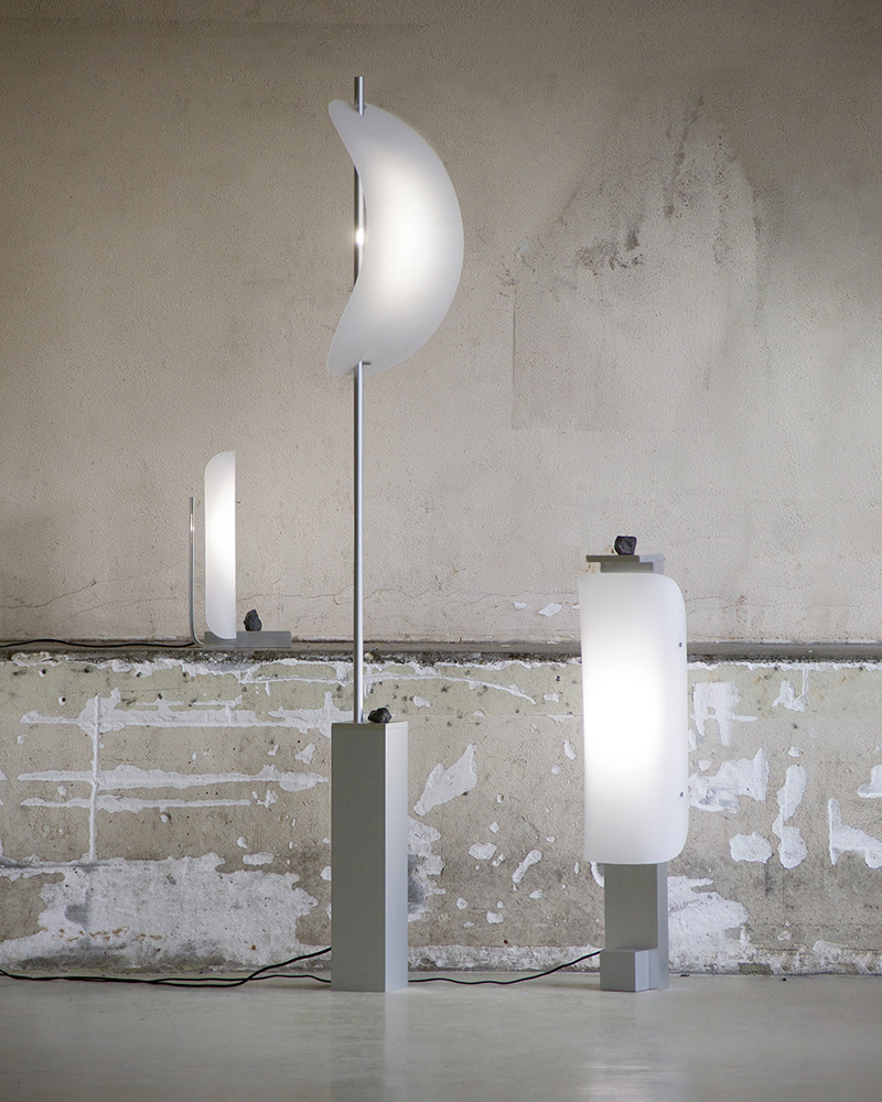 La base des luminaires ressent l’une des caractéristiques naturelles de cette pierre, calculant ainsi sa position avant de la retranscrire en intensité lumineuse. Cette étape permet de ramener la sensibilité de l’illumination dans le geste qui la définit.