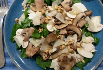 - Une salade épinards-champignons crus et cuits-noisettes-parmesan tout à fait délicieuse.