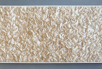 Dilplômé du très prestigieux Royal College of Art, Rowan Mersh aborde le textile de manière sculpturale.Installations, costumes, bijoux, il explore les possiblités du tissu stretch de manière unique. À la fois sobre et complexe, son univers géométrique joue avec la lumière et les volumes. À découvrir!Il assemble à la main les milliers de coquillages nécessaires à la réalisation de ses œuvres.Des tableaux réalisés à partir de milliers de coquillages – Rowan Mersh