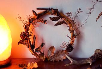 Au final , je me suis foutu un coup de pied au cul ( c'est un peu le but de ce rendez vous en plus ) , & je suis allé faire un tour en forêt avec l'Ours ( chose que je devrais faire un peu plus souvent , parce que c'est quand même bien agréable ) . On a ramassé plein de petites choses : des feuilles mortes , des fougères sèches , des pommes de pin , des branchages ... dans l'idée de les utiliser pour réaliser une couronne d'automne .