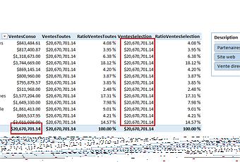 - Le ratio représentant le pourcentage des ventes de chacune des catégories par rapport aux ventes totales est affecté au niveau du numérateur (ventes par catégorie, filtrées pour les ventes directes) mais demeure inchangé au niveau du dénominateur (ventes totales)