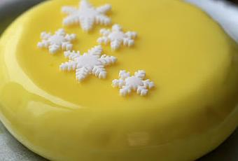 J'ai décoré mon dessert simplement avec des flocons de neige réalisés en pâte à sucre (étalée au rouleau avec du sucre glace ).
