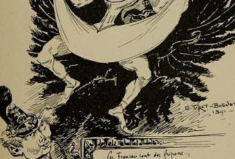 Voici ce qu'écrit Grand-Carteret à propos de cette caricature: "Wagner, première danseuse du théâtre de Munich, se profile pittoresquement sur les armes de l'Empire allemand, aigle à double allusion, caractérisant les contours anguleux du personnage, héraldisant ses sympathies." (Op.cit., pp.79-80).