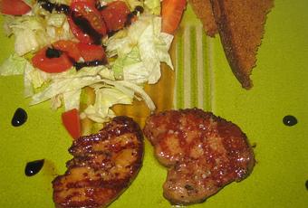 - arroser légèrement les tranches de foie gras poêlé ainsi que la salade avec le sirop de vinaigre balsamique