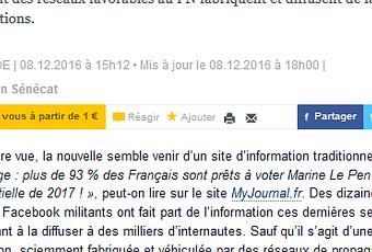 Mais qu’importe la crédibilité plutôt qu’on ait l’ivresse de la visibilité médiatique, n’est-ce pas ? L’article des décodeurs a le mérite de révéler comment un certain Yann Gouriou, par le biais de tout un tas de sites qui lui appartiennent (MyJournal.fr , MySondage.fr. , MyAnnuaire.com.relayés par l’éco-système du FN (par exemple, la page officielle de l’eurodéputée M.Le Pen sur Facebook) a réussi à diffuser ce genre de hoax ridicules, et comment il a pu être repris sans être vraiment contrarié jusqu’à présent dans sa démarche d’enfumage… CQFD.