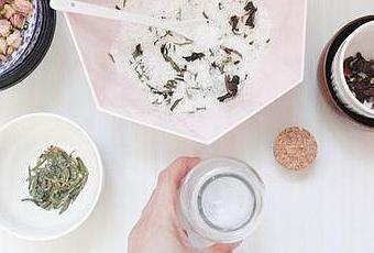 Ingrédients pou 1 bain | 1 grosse poignée de sel d’Epsom – 1 grosse poignée de sel de la Mer Morte – 1 grosse poignée de bicarbonate de soude – Boutons de rose – Fleurs d’Hibiscus – Feuilles de thé vert – 1 cuillère à soupe d’HE de Jojoba – 5 gouttes d’HE de Lavande – 5 gouttes d’HE d’Ylang Ylang