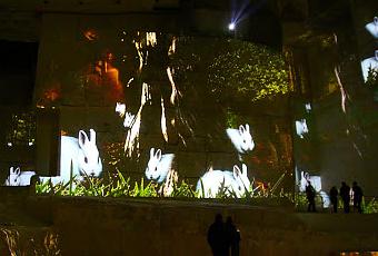 La projection débute par une balade dans une forêt enchantée avec des centaines de lapins blancs qui surgissent d'un peu partout...