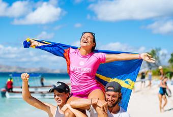 Portée par sa meilleure amie Bianca Buitentag et son coach Simon Paillard, Johanne Defay laisse libre court à ses émotions. © WSL/Ed Sloane