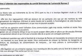 Pour terminer sur le sujet des fake news, un petit exemple avec Bagelstein qui en a fait les frais. Une fausse lettre adressée au comité féministe de l’université de Rennes aux propos diffamatoires et sexistes avait été publiée (voir image ci-dessous) et avait fait le buzz sur le web. Un buzz renforcé par la stratégie de communication de Bagelstein jugée souvent « limite » voire discriminatoire. Le résumé de l’affaire peut être retrouvé ici et nous prouve que les fake news peuvent non seulement s’avérer dangereuses pour les internautes (désinformation) mais aussi pour les marques en réveillant ou déterrant un bad buzz.