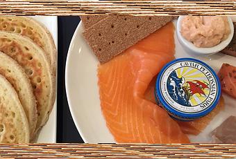 On y découvre le Reuben, sandwich à l'esturgeon Beluga façon pastrami, le royal crab roll céleri et gelée de jus de grenade, des harengs à la russe et pommes vapeur, une burrata crémeuse et oeufs de saumon, un divin croque-monsieur au caviar à déguster tiède (un must !), du saumon fumé royal, l'incontournable tarama ou des pirojkis à la viande ou au fromage.
